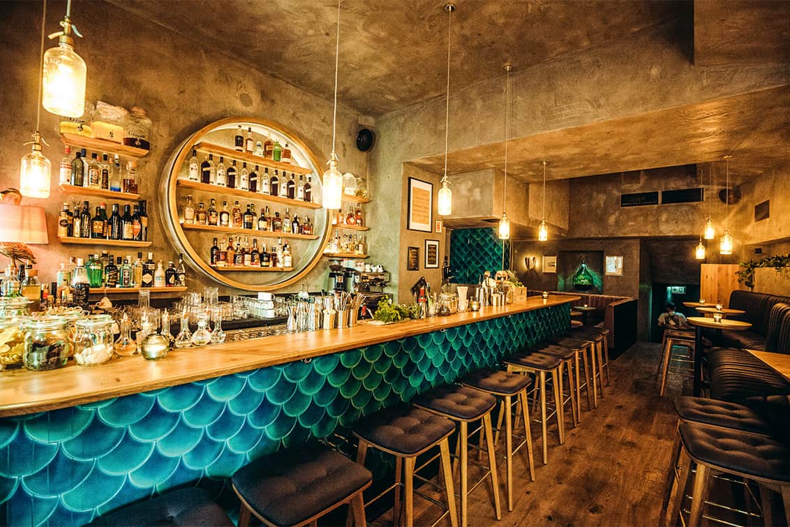 Blaues Flossenmuster und ein Bullauge: Sammy Walfischs neue Bar Moby Dick in Wien Neubau macht ihrem Namen alle Ehre – mit maritimem Chic und einem After-Work-Drink vom Chef höchstpersönlich.